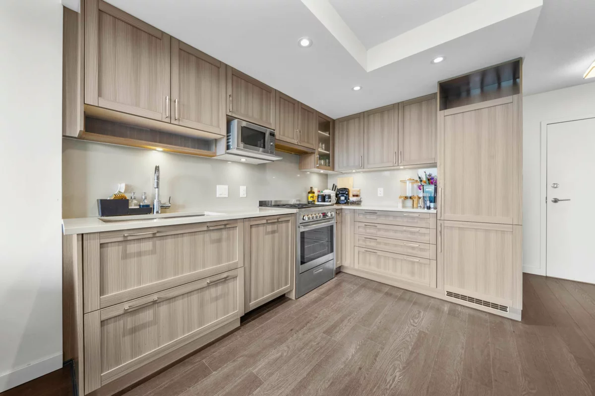 Welcome to Wall Centre Central Park Tower 3. Beautifully maintained 1 bed, 1 bath plus den and a flex space(in suite storage) features gorgeous modern shaker-style cabinetry, quartz counters, stainless appliances (gas range), integrated fridge, warm laminate floors, floor to ceiling windows allowing an abundance of natural light, creating a bright and airy ambiance. This unit comes with 1 Parking, 1 HUGE storage locker. The complex features impressive amenities; fitness centre, meeting room, roof top garden. Unbeatable location: steps to Joyce SkyTrain Station, Central Park, minutes to Metrotown, all groceries, cafes, restaurants, schools, transit and more! Perfect for Investors or first time buyers. Move in ready!