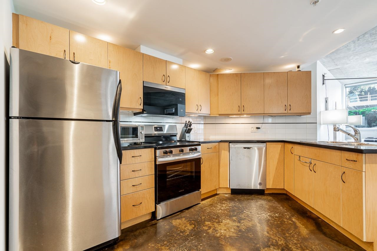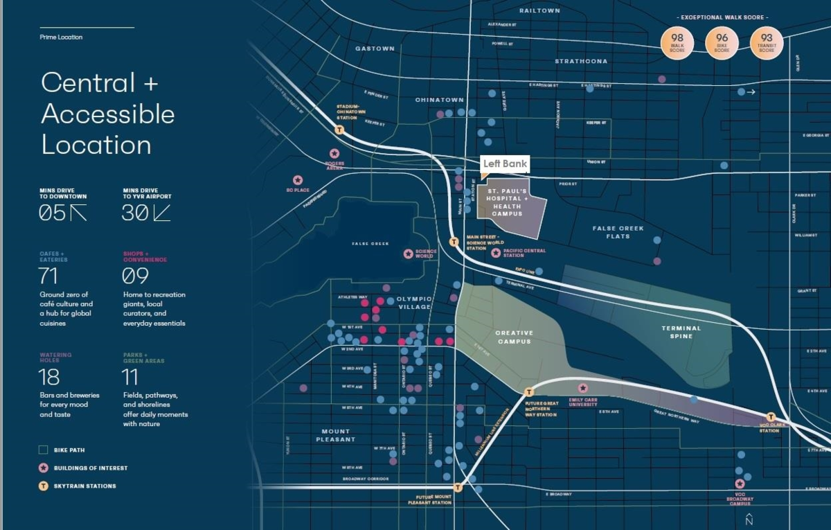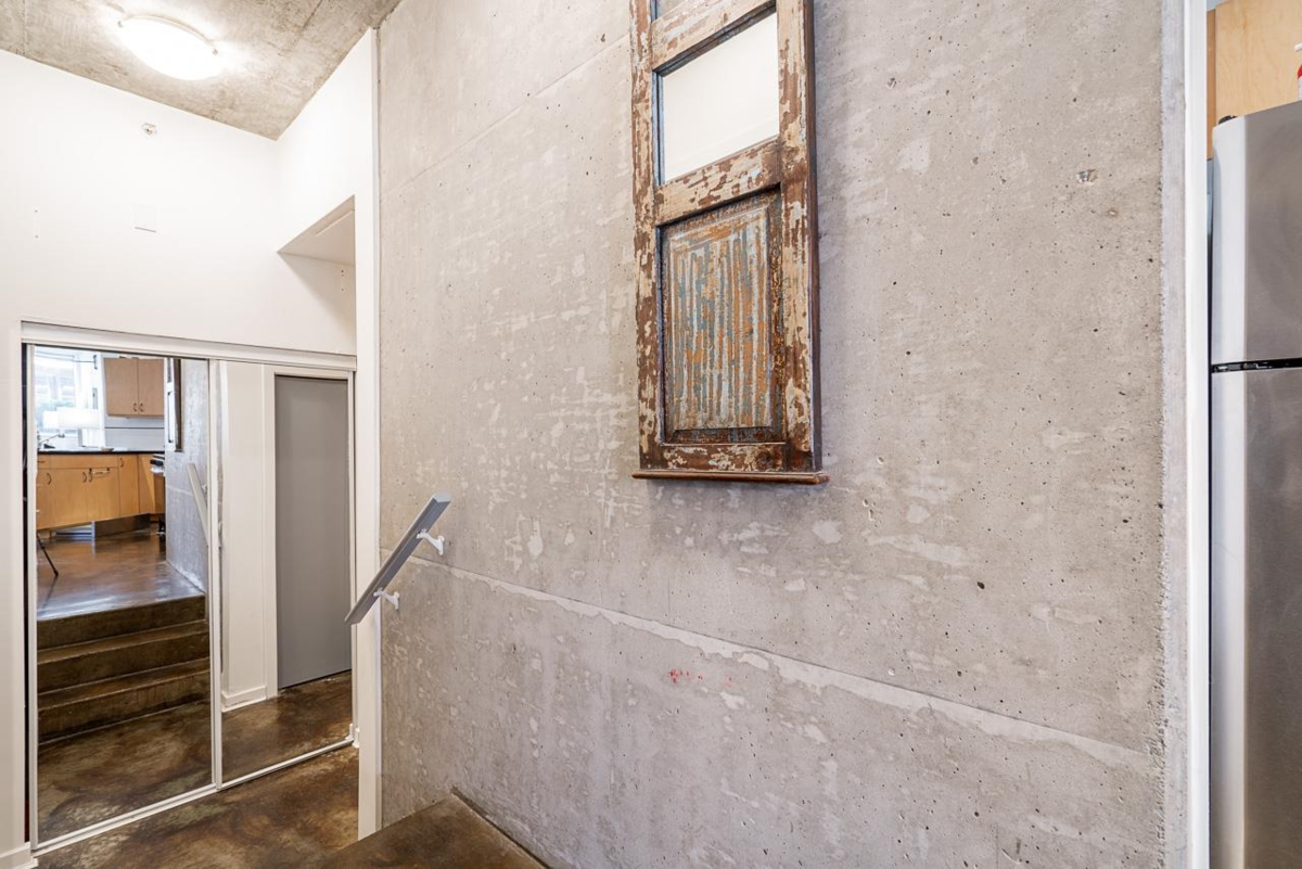 The Left Bank. This rarely offered 1 bedroom townhouse plan showcases an industrial look with a focus on polished & raw concrete, clean lines, & an abundance of natural light. Walk out your private entrance on the quiet side of the building, steps away from vibrant Chinatown & minutes from the heart of downtown and the seawall. Amazing restaurants, night life & transit are all around. The unit has dual entrances, an efficient layout with distinct dining & lounge spaces, a linear kitchen with angled peninsula, perfect for entertaining or working from home + large in-suite storage room for all of your gear. 1 parking included & 2 pets allowed. Watch the neighborhood grow & thrive as the new St.Paul's Hospital + adjacent, architecturally stunning Nexus office & retail complex near completion.