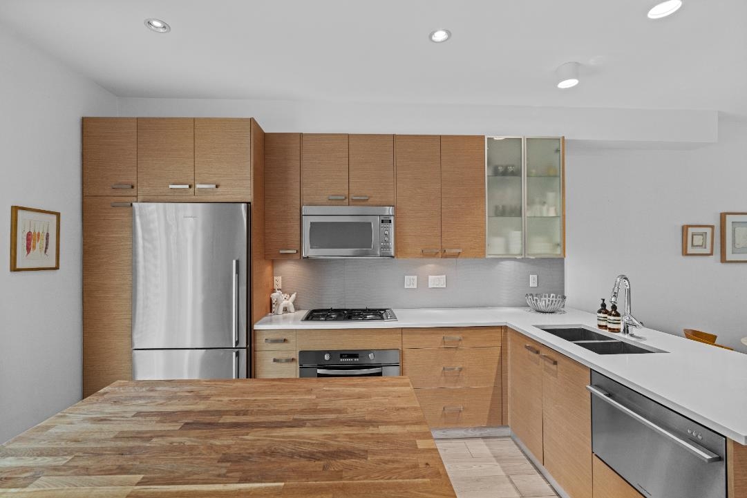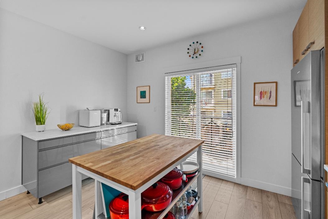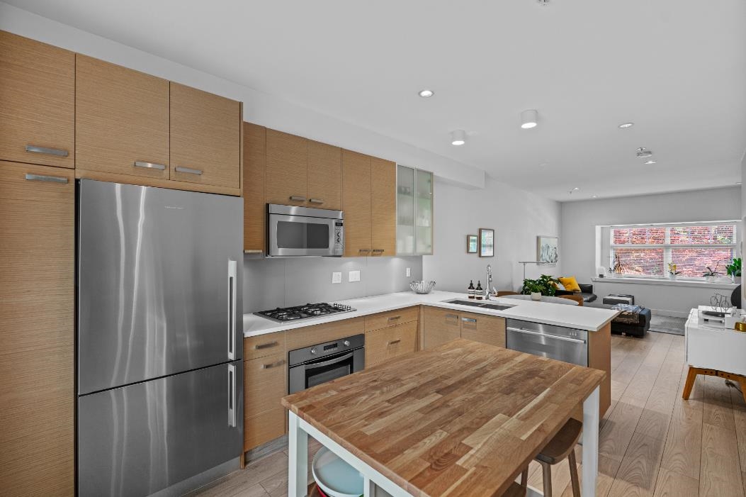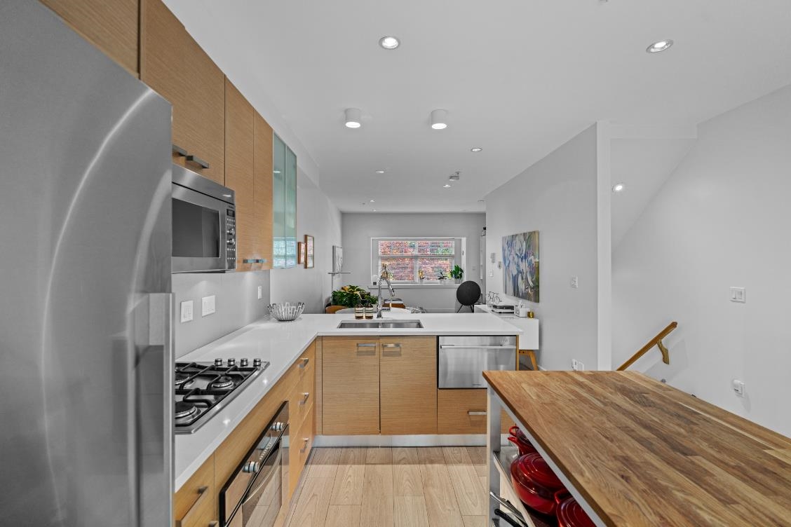 Welcome to this charming London-style brick rowhome in a boutique 6-unit complex. This spacious and beautifully maintained residence feels like new, featuring 2 fully updated bathrooms, a modern kitchen with gas cooktop, skylights and new laminate flooring throughout. Upstairs you will find 2 generous sized bedrooms and plenty of natural lighting. The main floor boasts an open concept layout, perfect for entertaining, with a bright kitchen that opens onto a private porch, complete w/BBQ hookup for summer nights. Entry level boasts a 3 piece bath & bedroom (no closet) or use as a perfect work space. Enjoy the convenience of an enclosed garage with direct access to your suite. Ideally located close to everyday amenities and transit!
