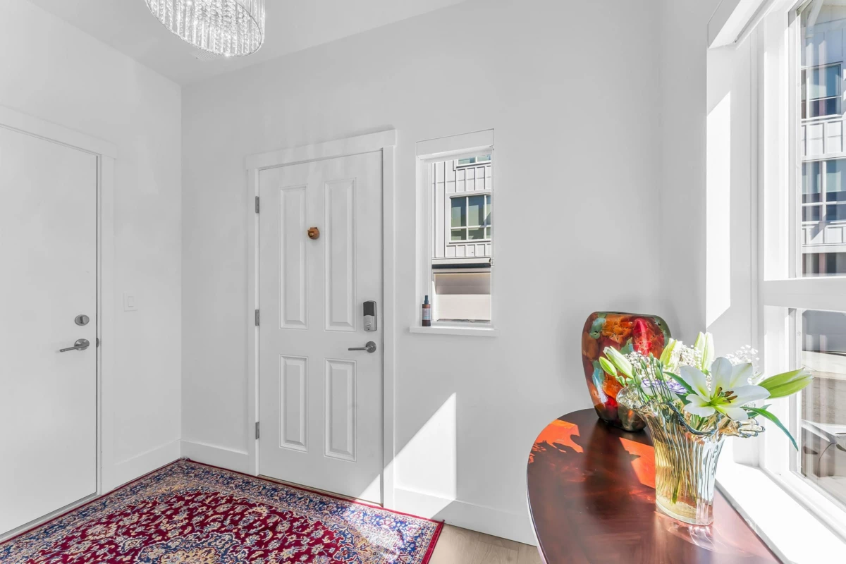 This is an exceptionally rare end-unit, two-story townhouse with three exposures and a side-by-side double garage. The unit is centrally located in the complex, facing the community garden, offering a peaceful and comfortable environment. The living room features an impressive open-to-below ceiling. Among the four bedrooms, two are en-suites, with the primary bedroom located on the main floor. The spacious family room is upstairs, along with three bedrooms, one of which is an en-suite with direct access to the large rooftop terrace. The entire home is equipped with central air conditioning. The property is only one year old and comes with a 2-5-10 New Home Warranty.