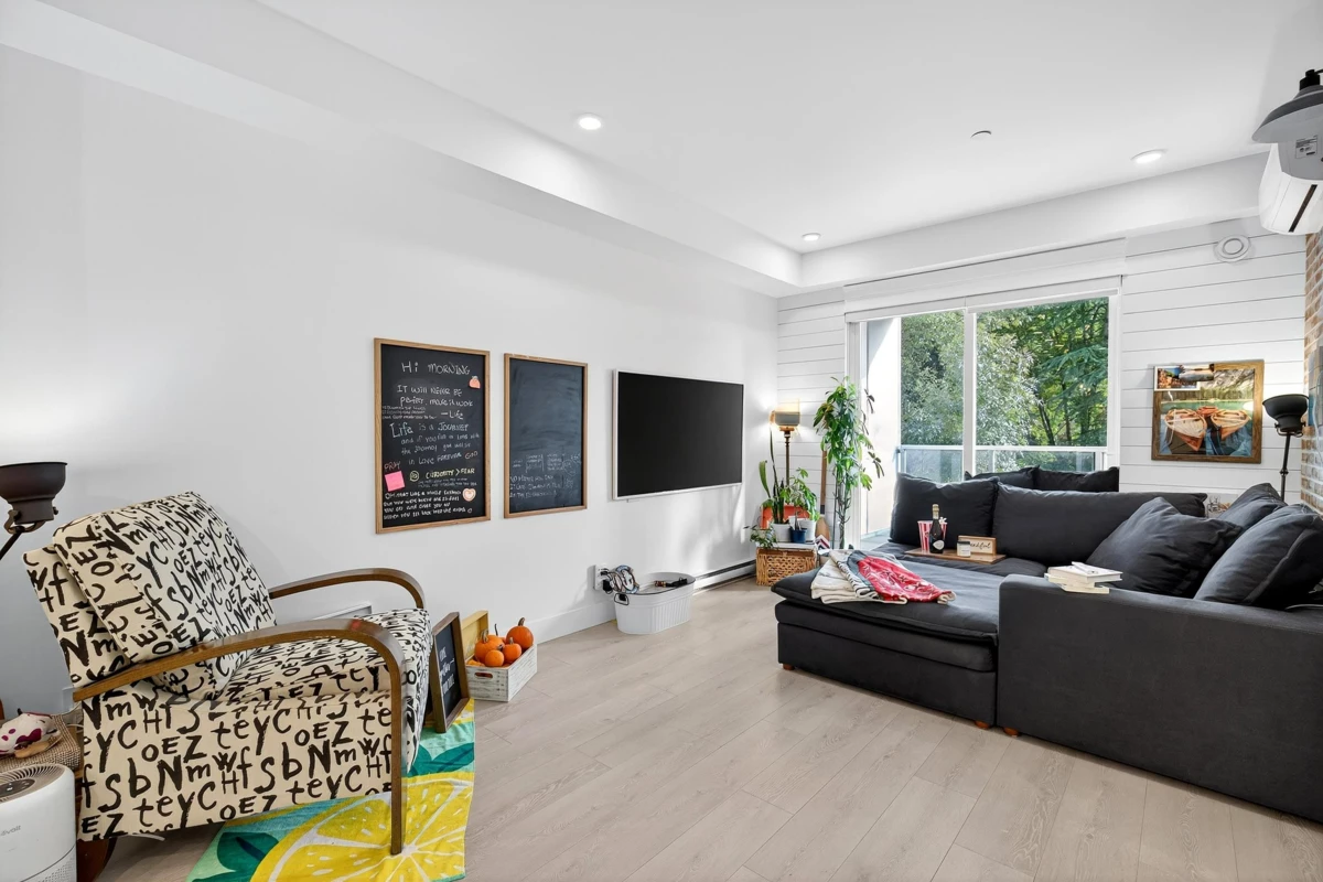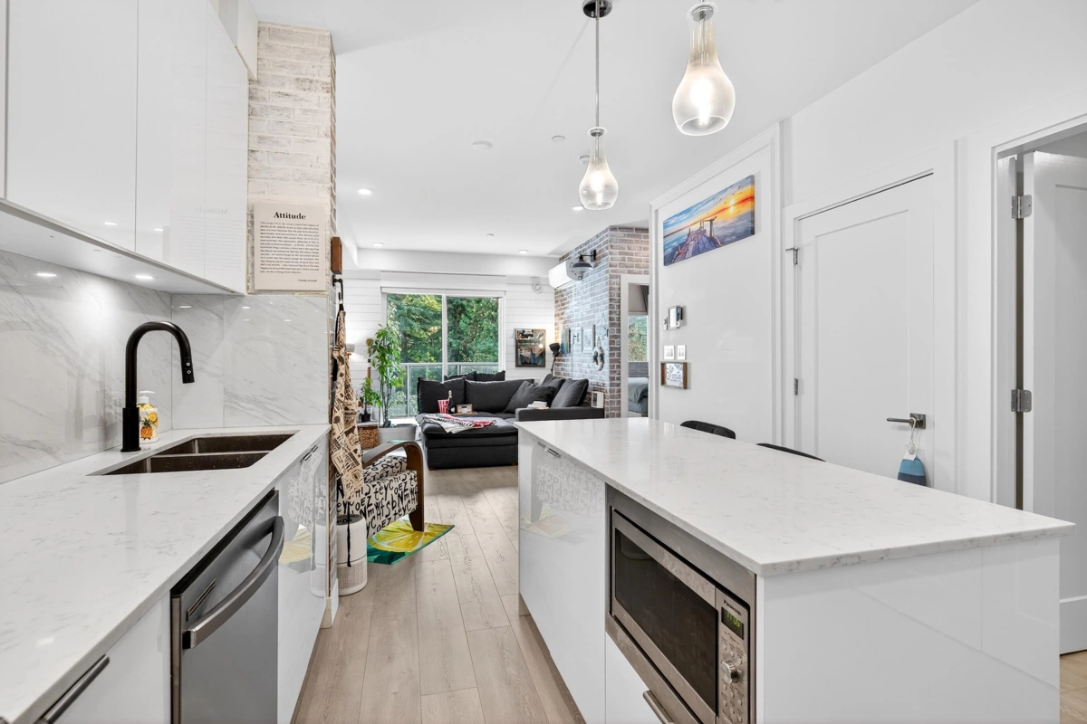 Nestled in sought-after Willoughby Heights, this 715 sq. ft. 2 bed, 1 bath home is perfect for first-time buyers, retirees, or investors. Overlooking a tranquil east-facing greenbelt, the open layout and 9-ft ceilings fill the space with natural light. Enjoy a 145 sq. ft. balcony with gas hookup—ideal for grilling and entertaining. Features include quartz countertops, a large island, smart thermostat with A/C, stainless steel appliances, and laminate flooring. Pet and rental friendly with amenities such as a fitness center, rec room, playground, and car wash. Close to shops, restaurants, transit, and Hwy 1. OPEN HOUSE NOV. 22, 11:30am - 1: 30pm