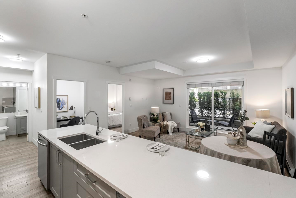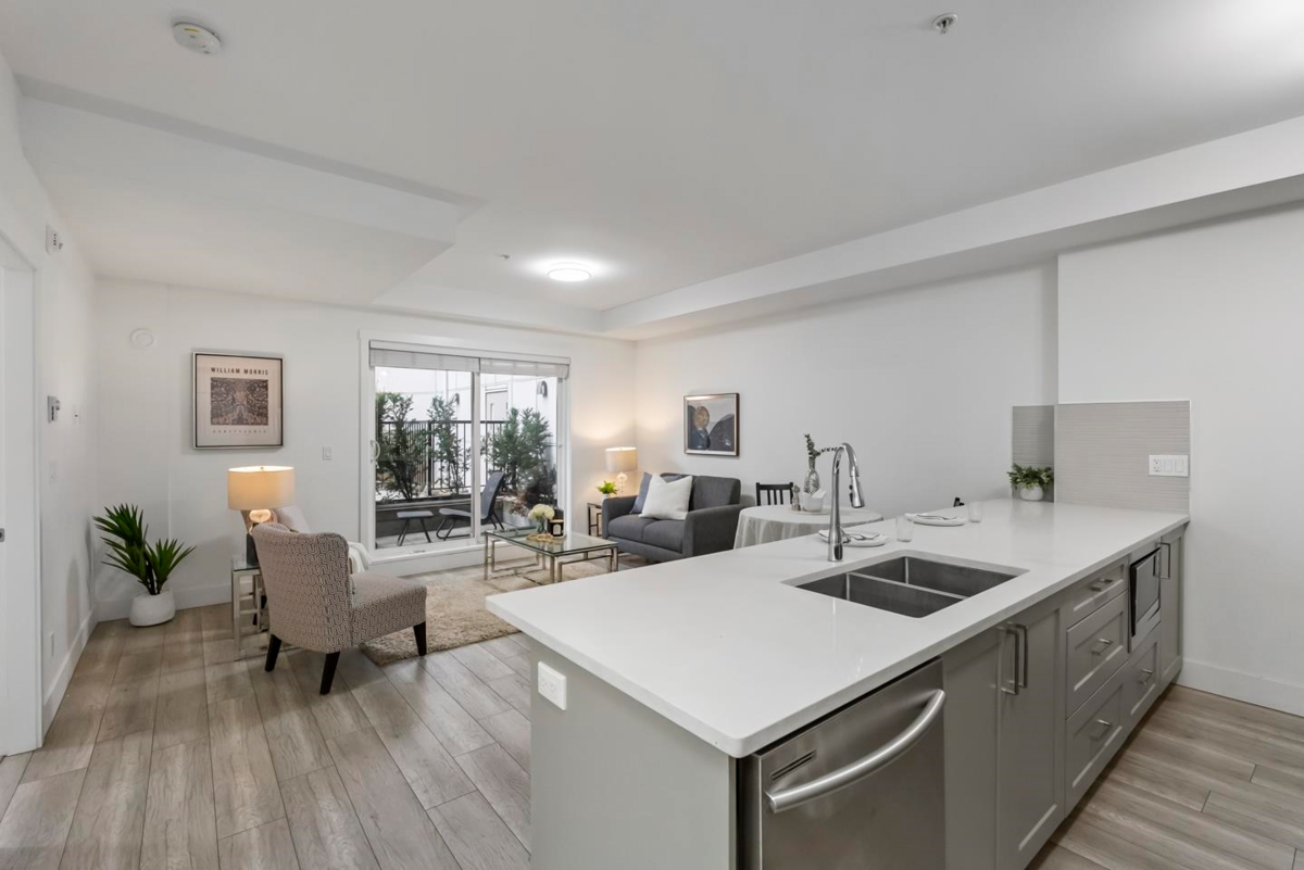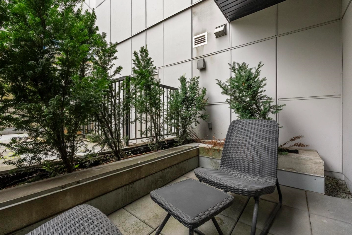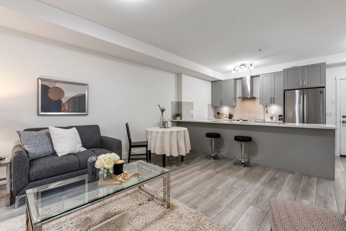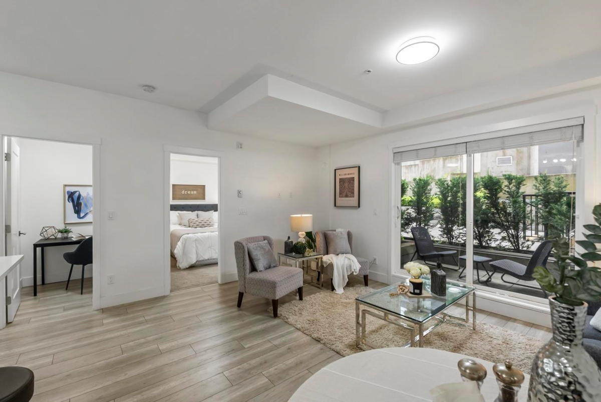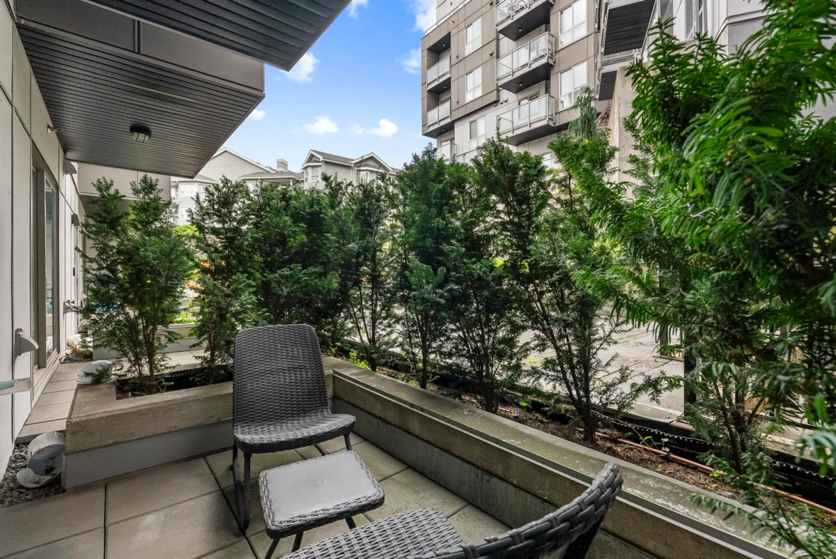 Rare 1 BED + DEN layout on the GROUND FLOOR with 2 PARKING stalls at Fraser Landmark, perfect for first-time home buyers and investors. Enjoy ultimate privacy on facing away from the street, no neighbours on either side, a spacious bedroom, walk-in closet, and a modern kitchen with expansive quartz countertops. Two patios offer extra living space for relaxing or entertaining, and two parking stalls add convenience. Just steps from the future SkyTrain and minutes to schools, shopping, and Surrey Memorial Hospital, this home delivers unmatched convenience and long-term investment potential.