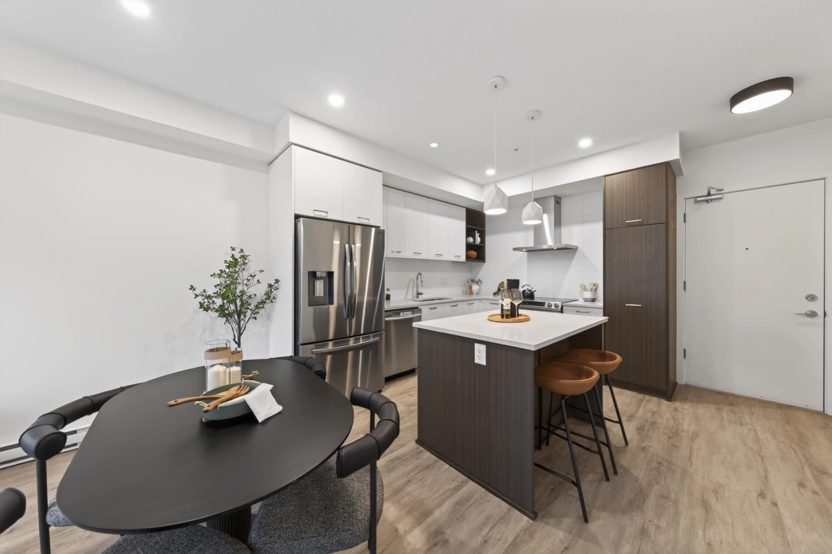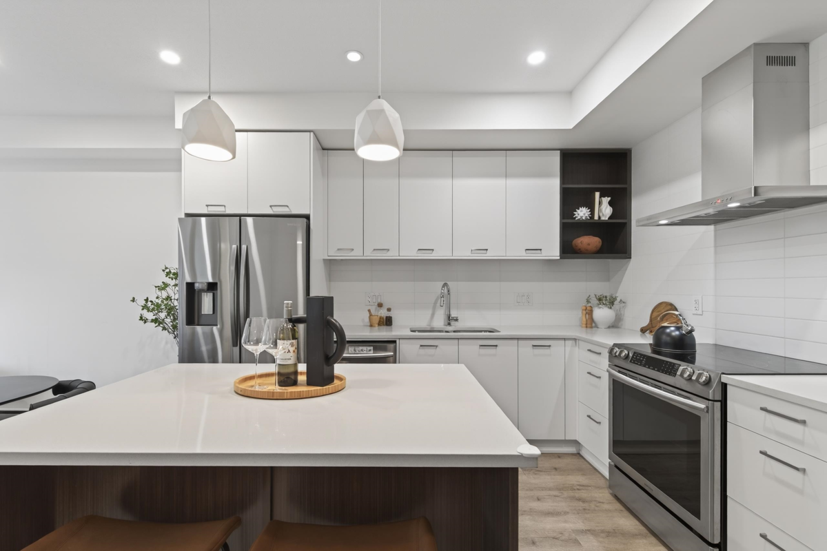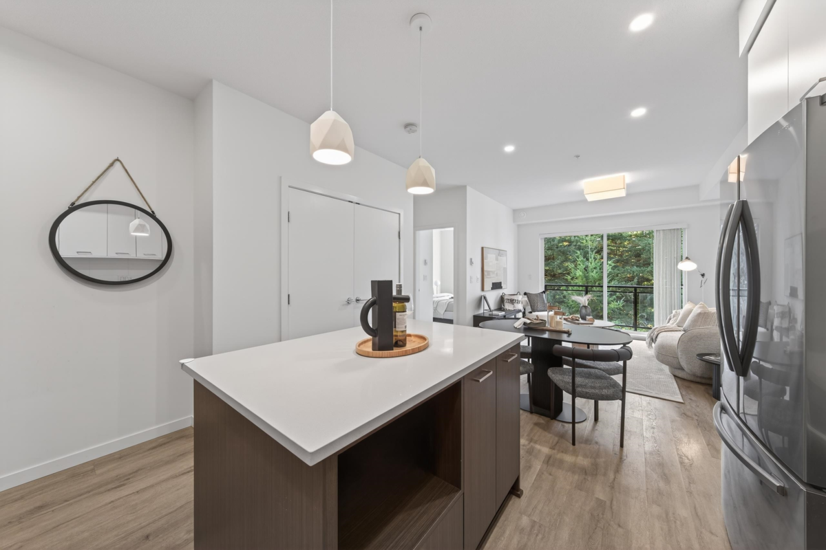 Sharp 1+Den, or potential Jr. 2 Bedroom residence! Well designed with an ideal open layout. This spacious home includes an L-shaped kitchen with three appliance and a large island/ bar area, seamlessly flowing into the dining space and living zone. The generous sized bedroom has plenty of room for comfort and style, while the spacious den can easily accommodate a single bed with storage, or serve as a serene home office. Three piece bathroom with double sink. Rarely does a property in this sought after neighbourhood at this value become available. Good distance to grocery stores, malls, reputable restaurants, and coffee shops etc. Great school district. Well maintained rental unit since completion, vacant and available for quick possession. Call to schedule a viewing today.