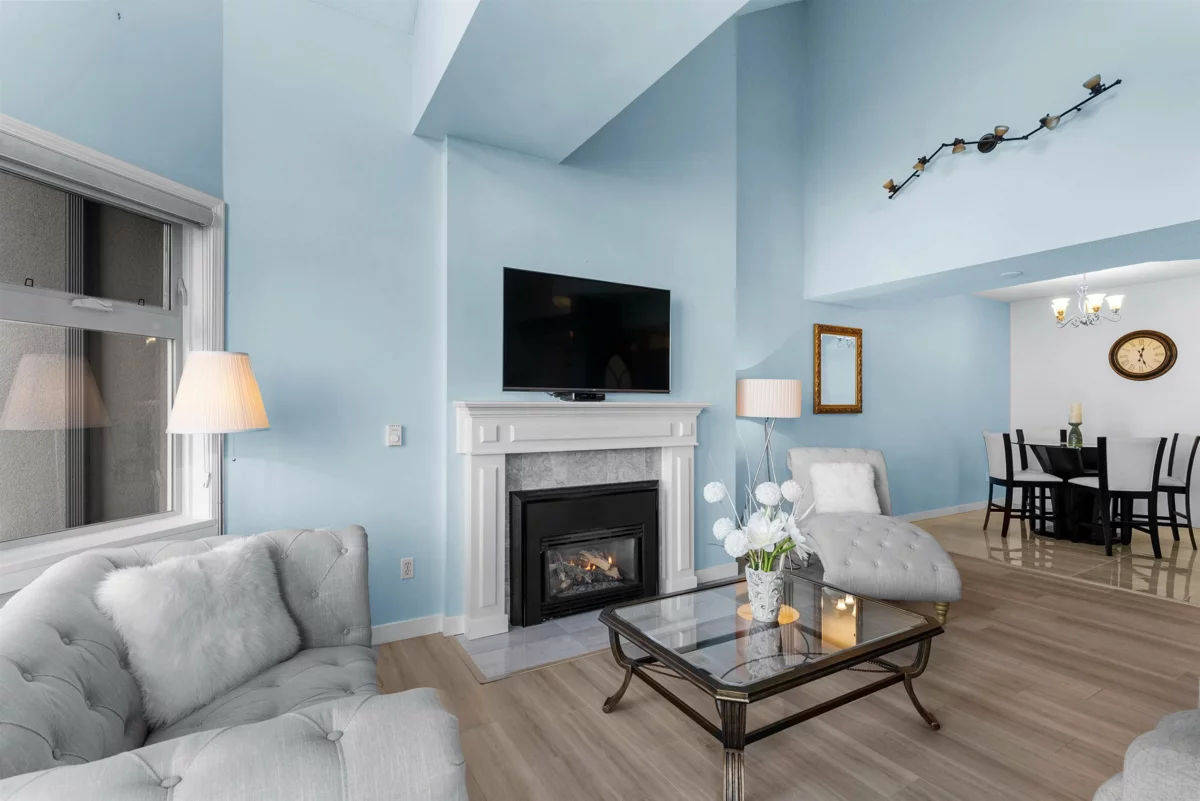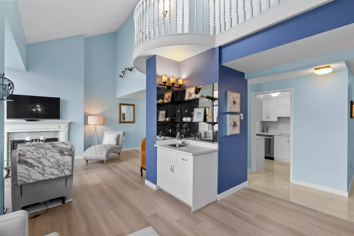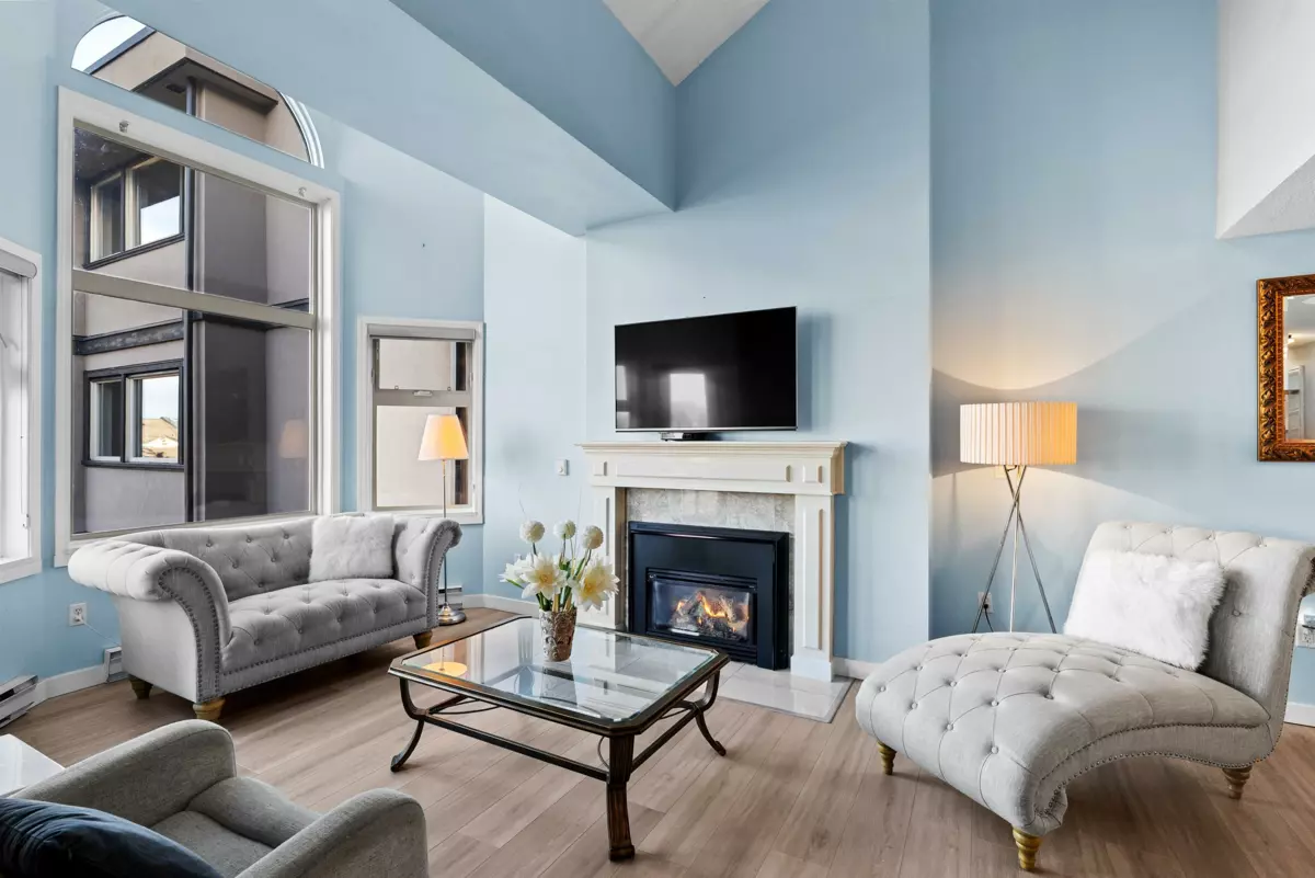 Two-Level Penthouse with access from the 5th and 6th floors in one of Ladner’s only concrete, rain screened buildings! Bright and airy with 1878 sq.ft. of living space, 19-ft vaulted ceilings, and two-story windows that fill the home with natural light. The main level features a brand-new kitchen and heated floors, spacious living and dining areas, cozy gas fireplace, and primary bedroom plus ensuite. Upstairs offers two additional bedrooms or office/flex space with its own private entrance. Enjoy North Shore mountain views, a large balcony, and an unbeatable central location just steps to shops, dining, and parks! Two parking spots! Pets allowed w/restrictions (1 dog and 2 cats)