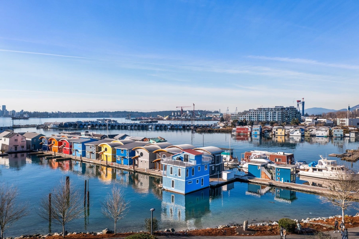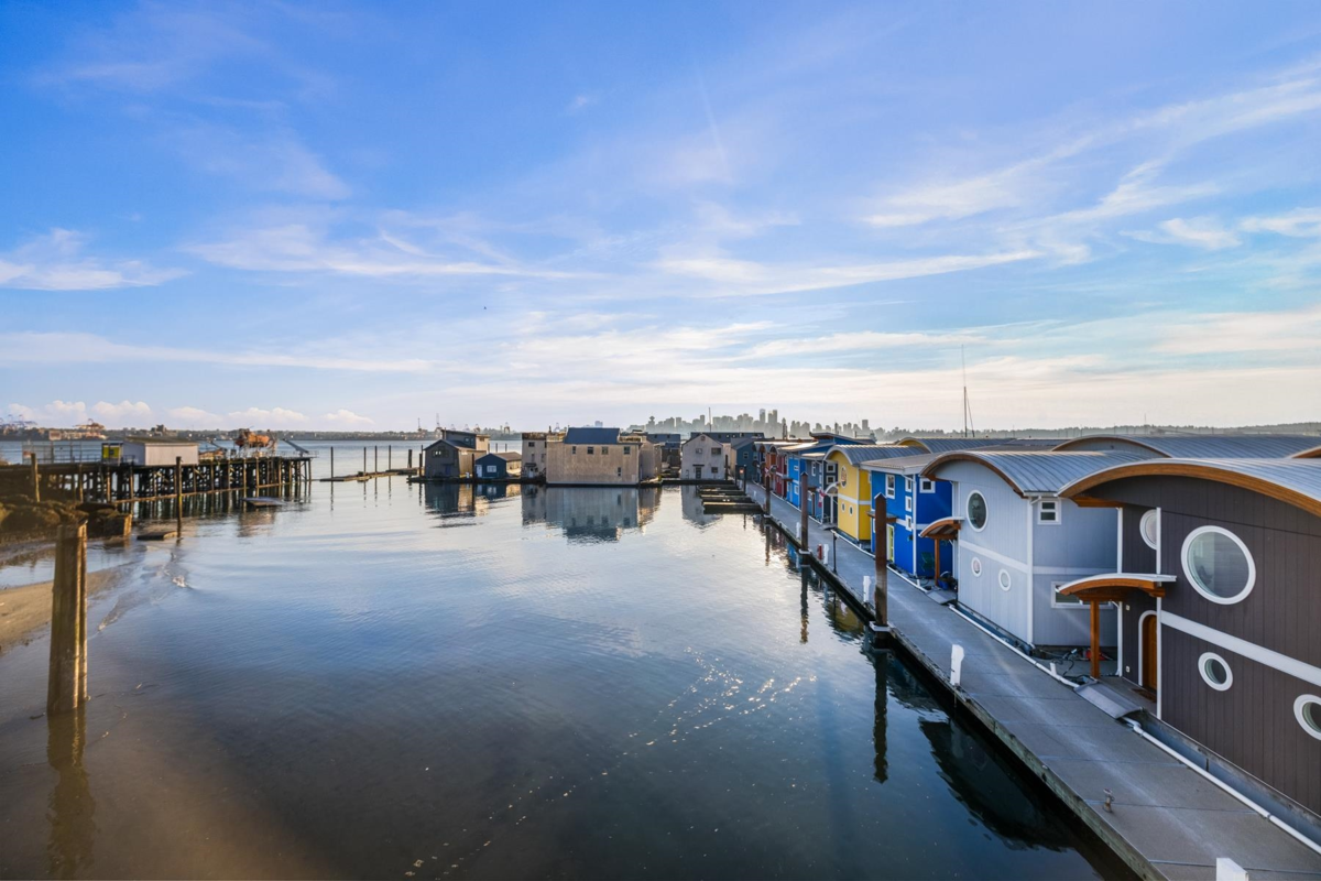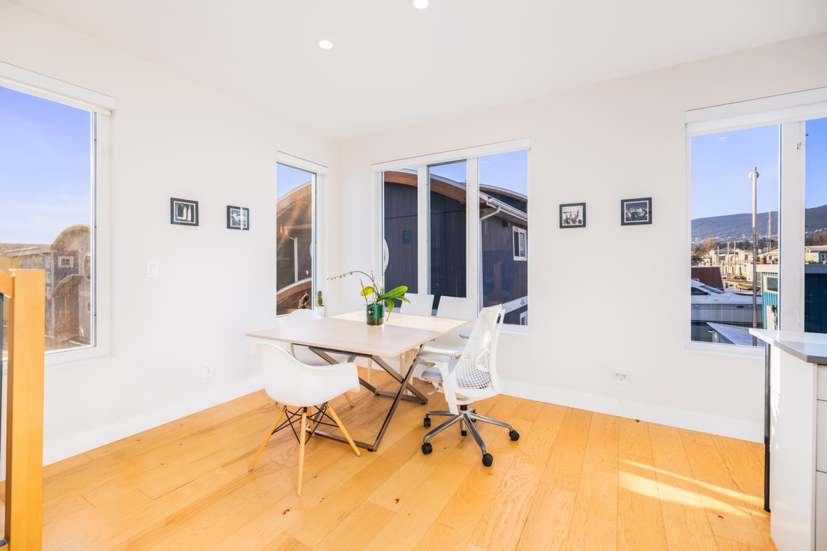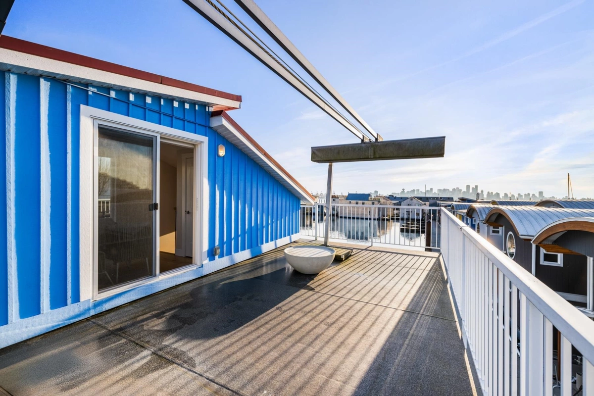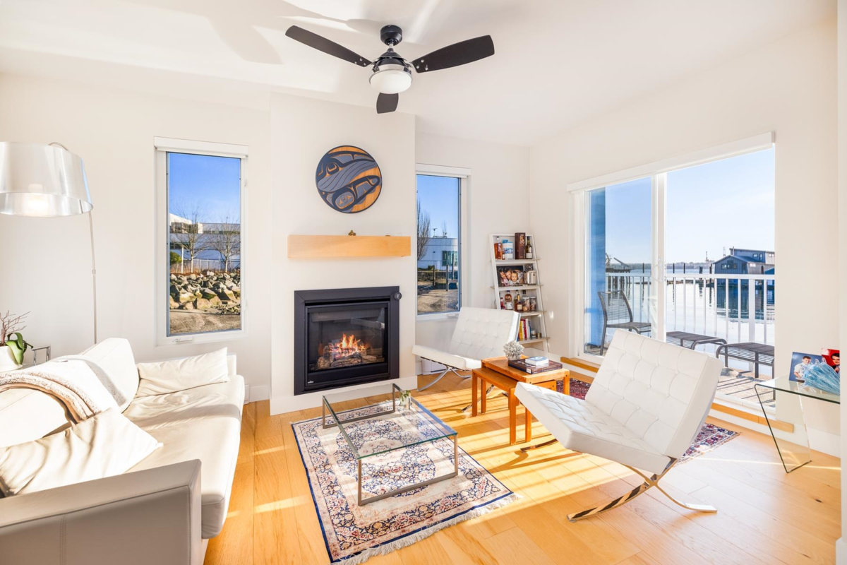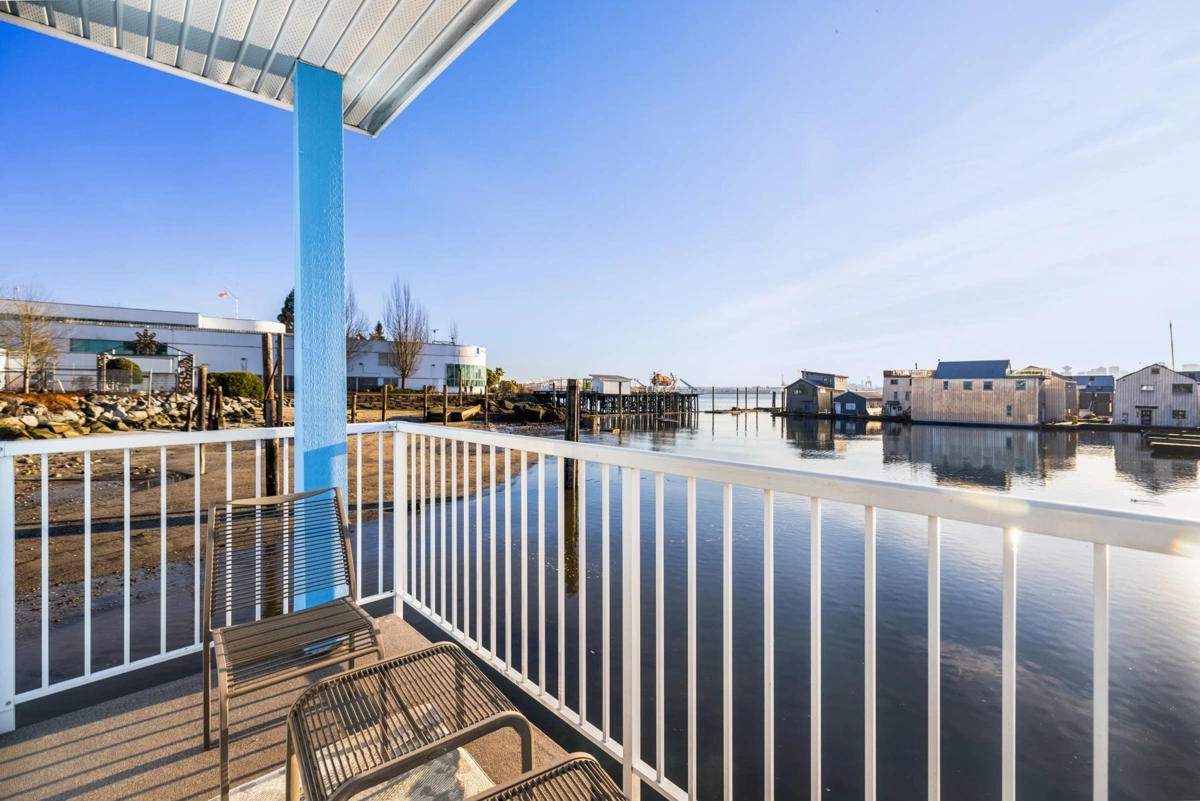 Experience the ultimate waterfront lifestyle at Mosquito Creek Marina in this newer built floathome designed for relaxed West Coast living. The highlight is a spectacular 528 sq ft rooftop deck with panoramic views, complete with water, power, and gas for effortless entertaining or relaxing year-round. Smart reverse-plan layout maximizes light and views. Entry level offers a spacious foyer, two bedrooms, elegant 5-piece bath with separate soaker tub and shower, plus laundry and storage. Upstairs features open-concept kitchen and dining, pantry, powder room, and bright living room with gas fireplace opening to a sunny south-facing deck. Bonus 192 sq ft flex room ideal for office, guests, or studio. Pets and rentals, including AirBnB, allowed in this family-friendly community.