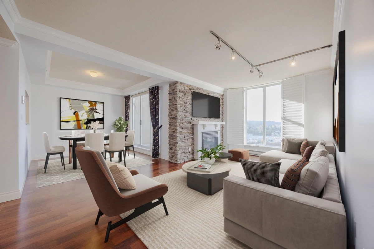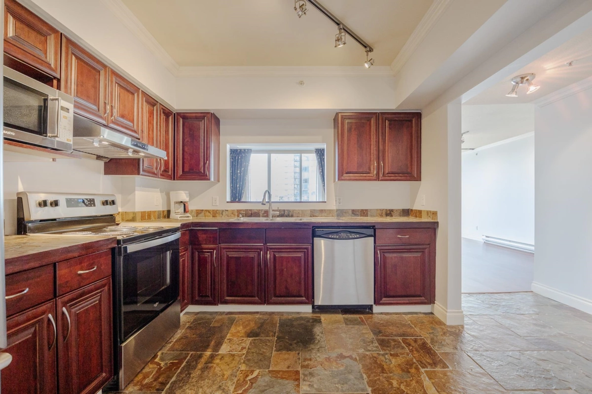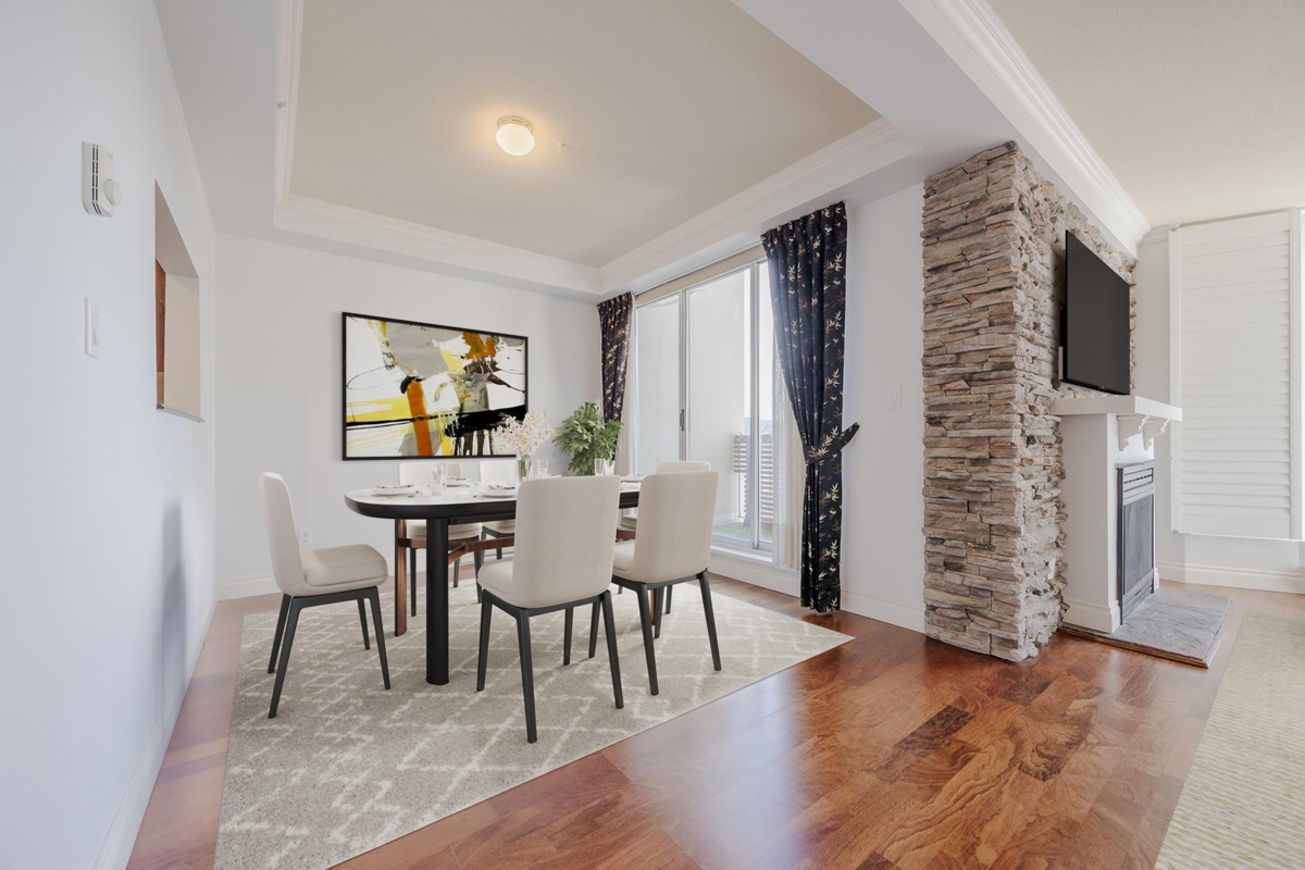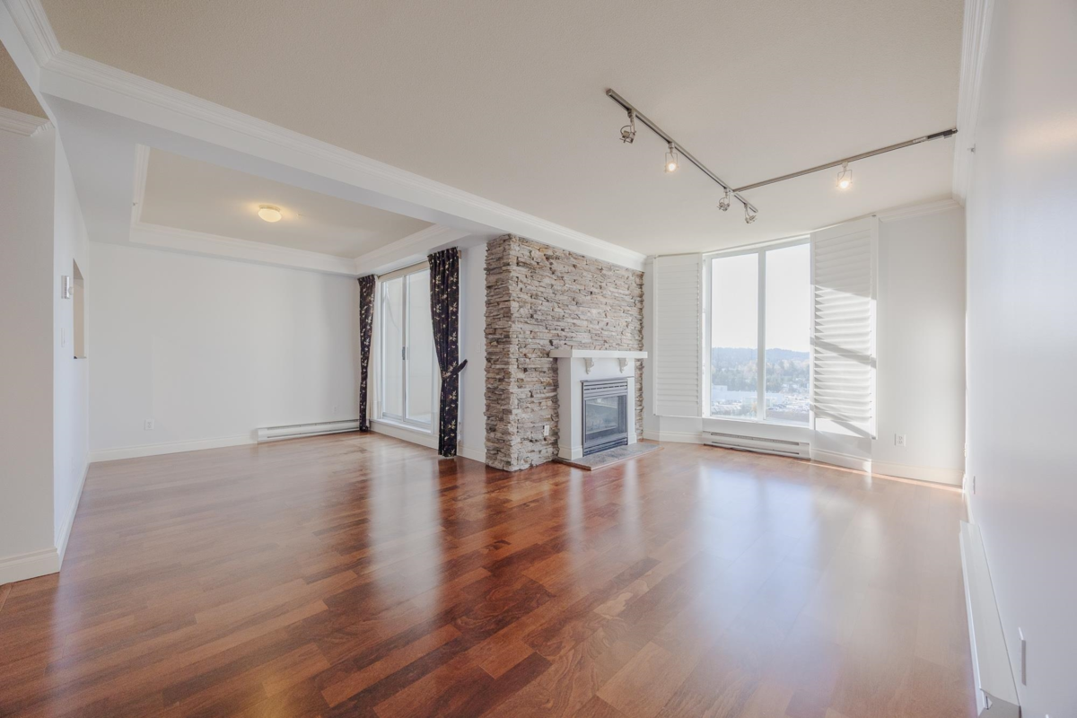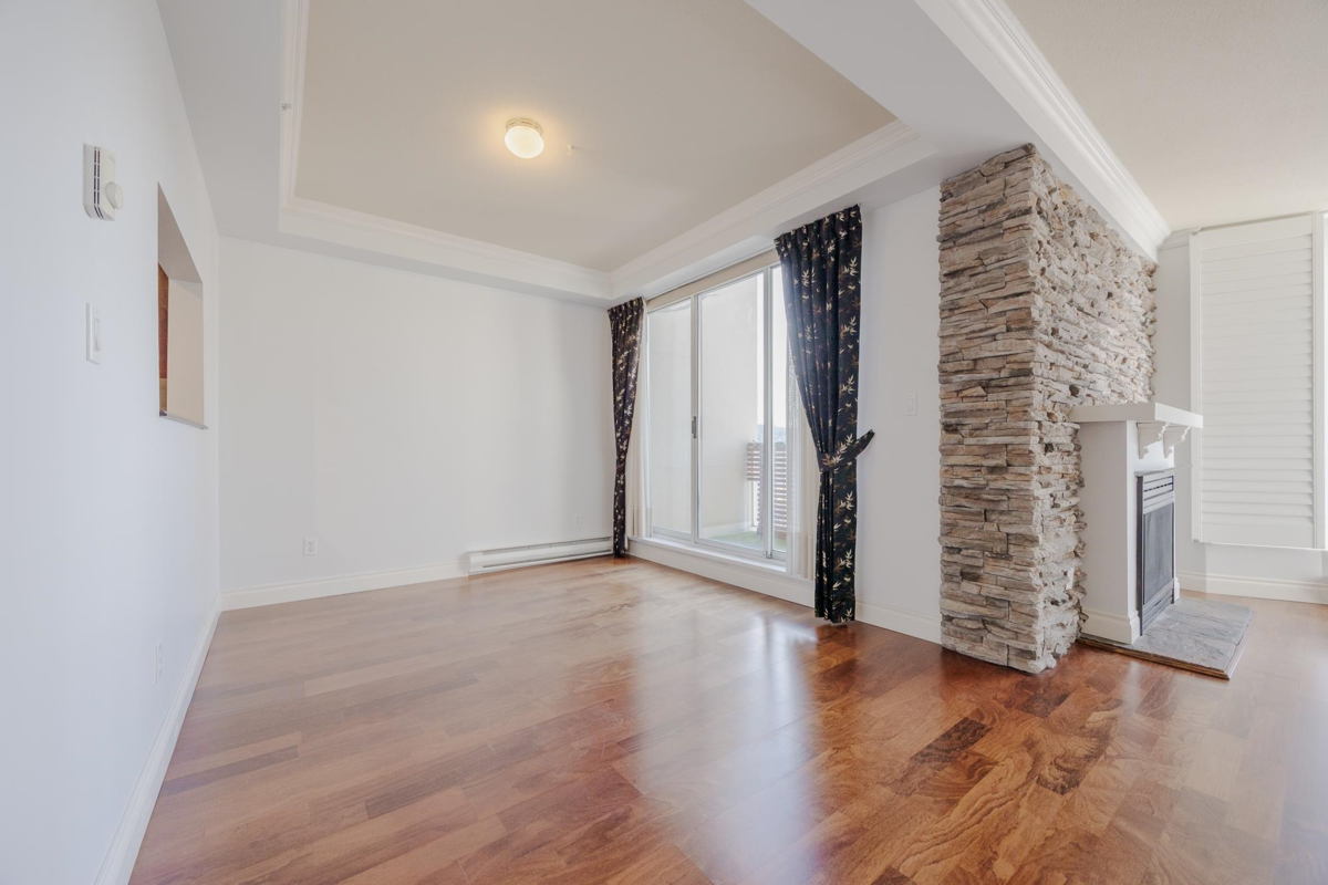 The Frontenac! This 3 bed/ 2bath 1450 sq ft top floor, corner unit is ideally located 1 block from the skytrain station, Coquitlam Center & all amenities. The main living space is bright & spacious featuring, several lg windows with California style shutters & a balcony, with views of the city & mountains. The beautiful brick fireplace & crown mouldings throughout the unit add a finished touch. The lg kitchen has S/S appliances, ample counter space & cabinets for all your cooking & entertainment needs. The Primary bedrm has a second balcony providing additional outdoor living space to enjoy quiet mornings or relaxing summer days. The ensuite features a spa like shower for extra comfort. The numerous closets, built-ins in the bedroom & insuite laundry adds to the convenience of this unit.