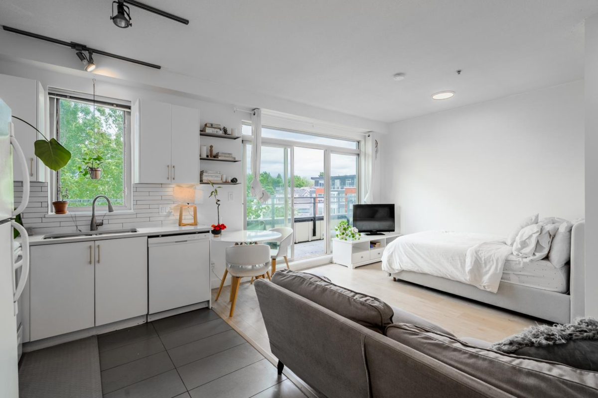 Welcome home to this north-facing penthouse studio with a private 168sf patio! This is the perfect starter home or could be a great investment for someone wanting to grow their Real Estate portfolio. This home greets you with new laminate flooring, fresh paint, updated quartz counters & some updated appliances, while the overheight ceiling & large windows brighten up the space w/ plenty of natural light. Step outside onto your oversized patio which boast beautiful views of the NS Mtns. This boutique building is situated in the heart of Fraserhood and within walking distance to all our favourite places - Matchstick, Jaybird, Savio Volpe, Earnest Ice Cream, grocery stores, parks - and just a short drive to the city, beaches, and more!