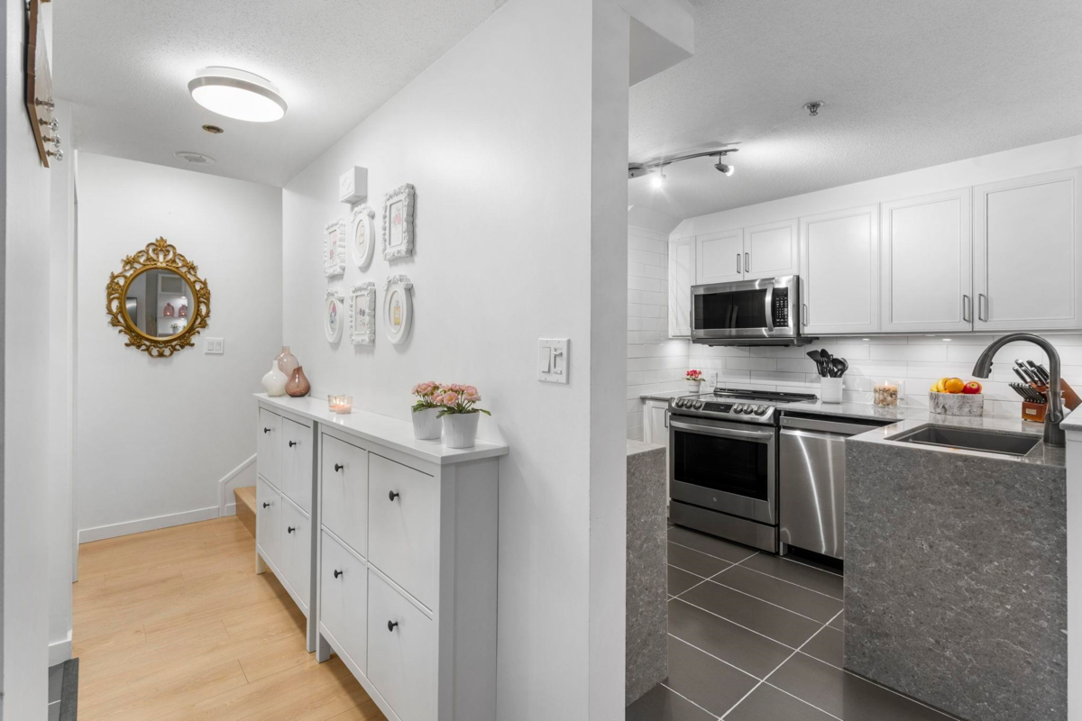 Rarely available! 2 LEVEL CONCRETE, end unit TOWNHOUSE near Brentwood Skytrain Station. Private entrance located on tree-lined cherry blossom street. 3 bedrooms, 2 bathrooms, 2 parking, 1 storage locker PLUS bike storage. Two private patios (front & back) perfect for lounging with the family. Located in the heart of all amenities, walking distance to Brentwood Skytrain, Save On Whole Foods, Winners, schools, daycare, restaurants & Willingdon Park. EXTENSIVELY RENOVATED IN 2020. Dream Kitchen-Quartz countertops w/waterfall, Tile work, full LG Appliance Package includes 36" fridge & pantry. Custom built in storage with under mount lighting throughout living & dining space. Both washrooms fully Renovated. The ultimate place to call home in BRENTWOOD PARK.