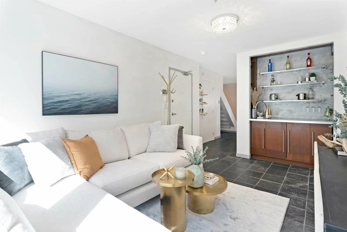 Rarely available & move in ready. This 2 level, 2 bedroom townhome is tucked away from the street in a secure & gated courtyard. One of only 4 townhomes in a detached building & part of the same strata as “Carrall Station” at 1 East Cordova. On the main level you’ll find a living room with nicely outfitted bar & access to a bright south facing balcony. A well equipped kitchen & dining area with under-stair storage & powder room round out the main floor entertaining area. Upstairs you have an amazing & bright master suite with vaulted ceilings & windows facing into the courtyard. Walk through a cozy office into a cheater ensuite full bathroom. The upstairs also features a second bedroom with a space saving Murphy bed. Nothing else on the market like it!