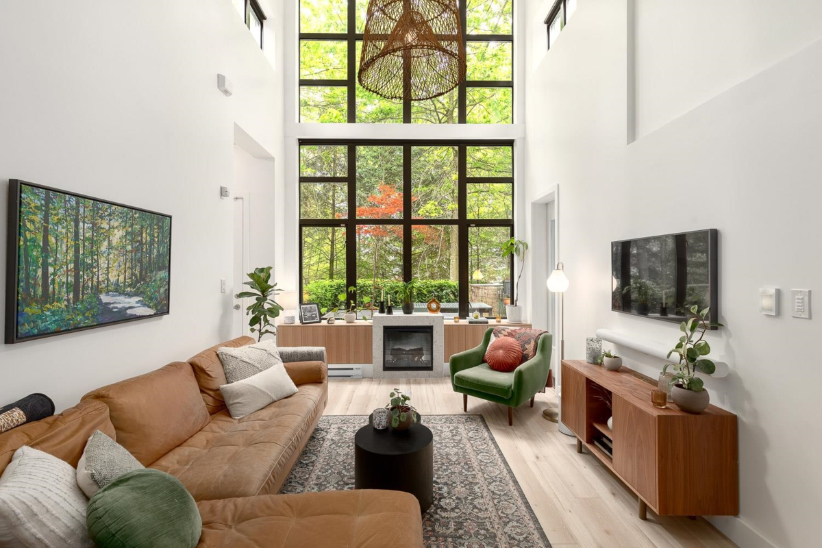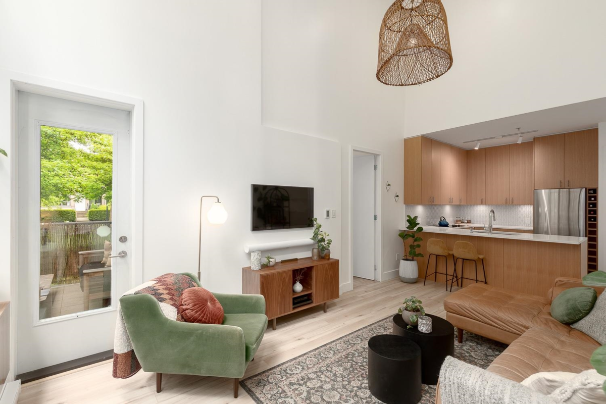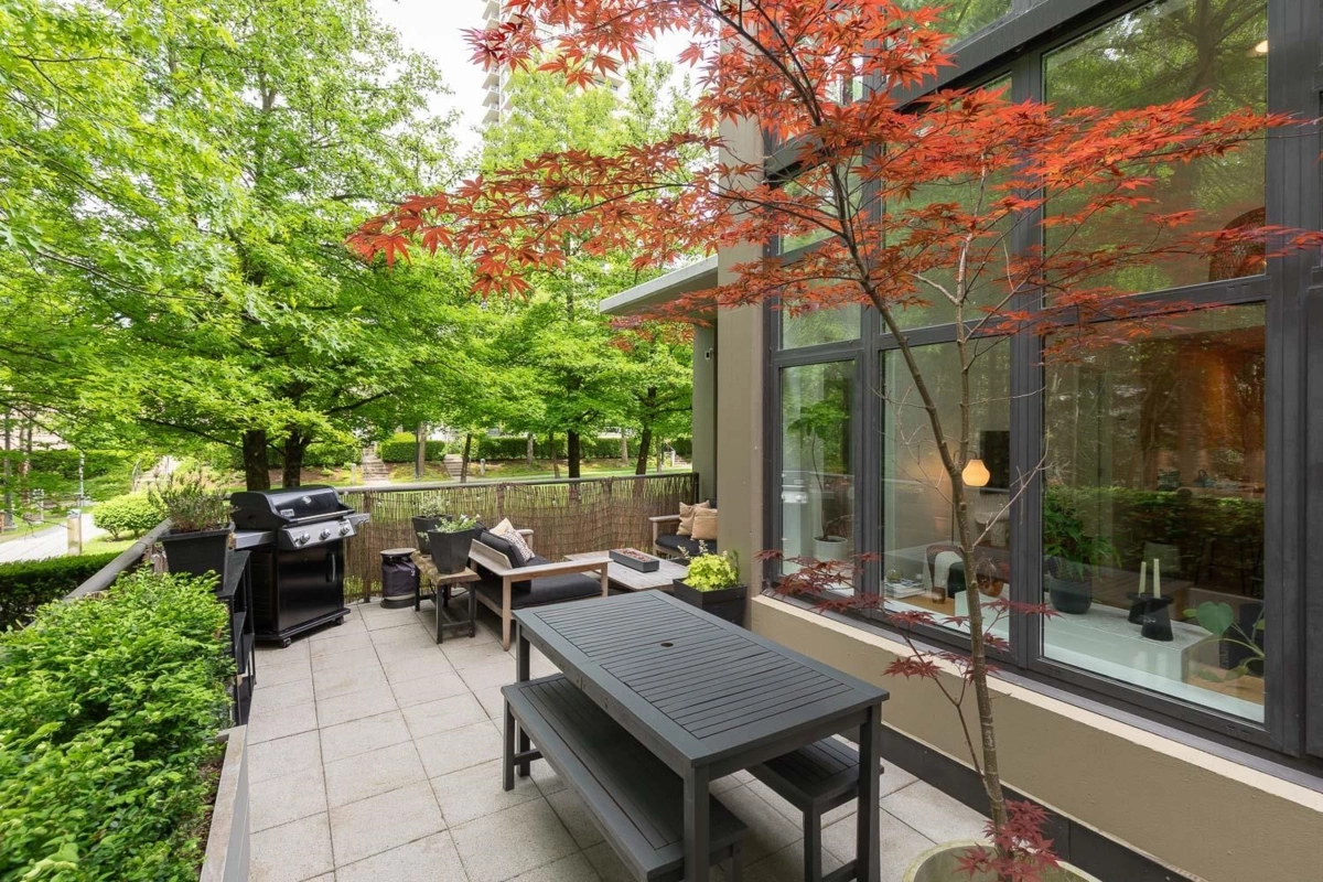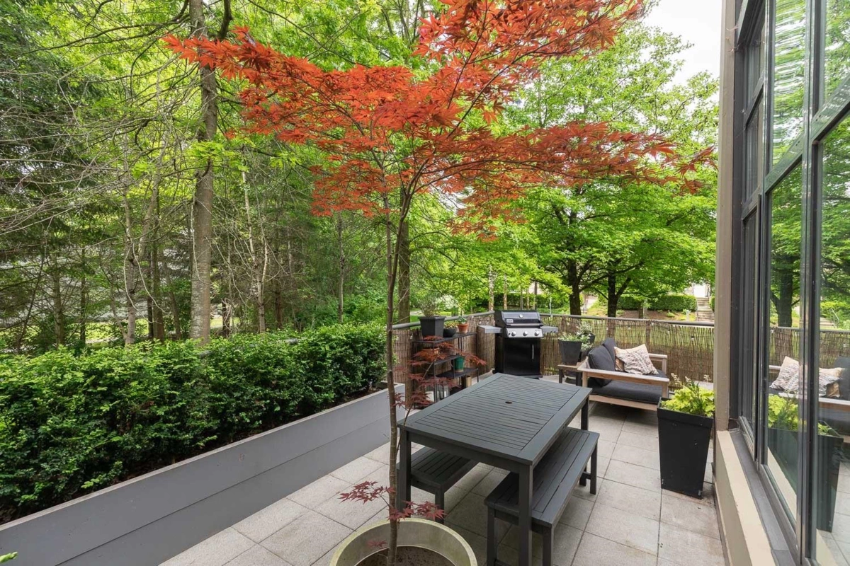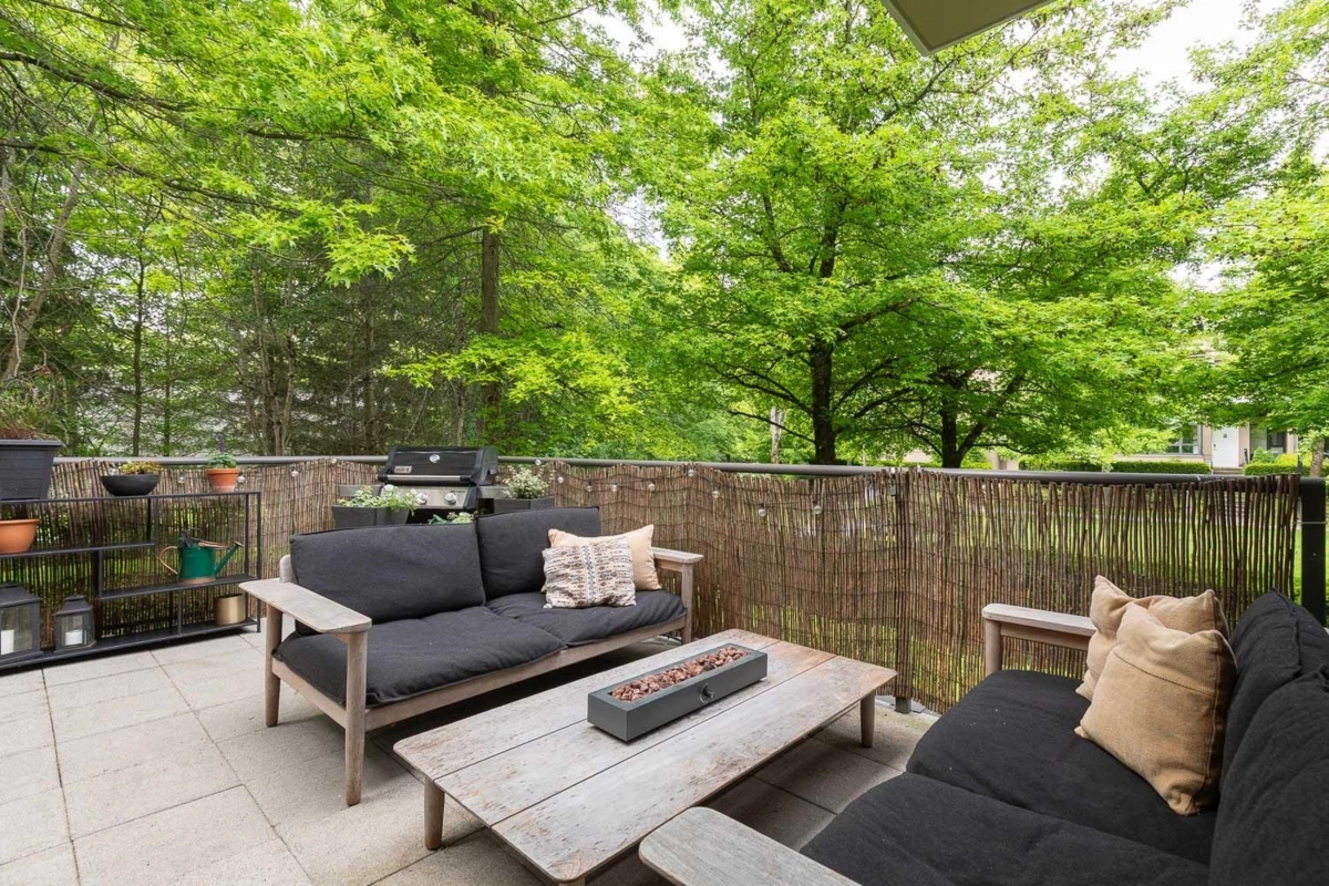 A stunning & modern renovation in a concrete townhouse with a massive patio + yard! This gorgeous 2 bed, 2 bath home was completely updated with custom-built white oak cabinetry, quartz counters and new appliances, new flooring throughout, new tiling and fixtures in the bathrooms, in floor heating & a customizable home automation system that controls the blinds and lights. Relax on your 450sqft patio or the large grassy area in front - enjoy the sun, the forest views and the easy in/out access - perfect for families and dogs. Includes the most ideal underground parking spot - right outside your door & just past the gate + 1 large locker. OMA is a quality concrete complex offering a big recreation space including sunny indoor pool, gym, sauna & more. SO GOOD!