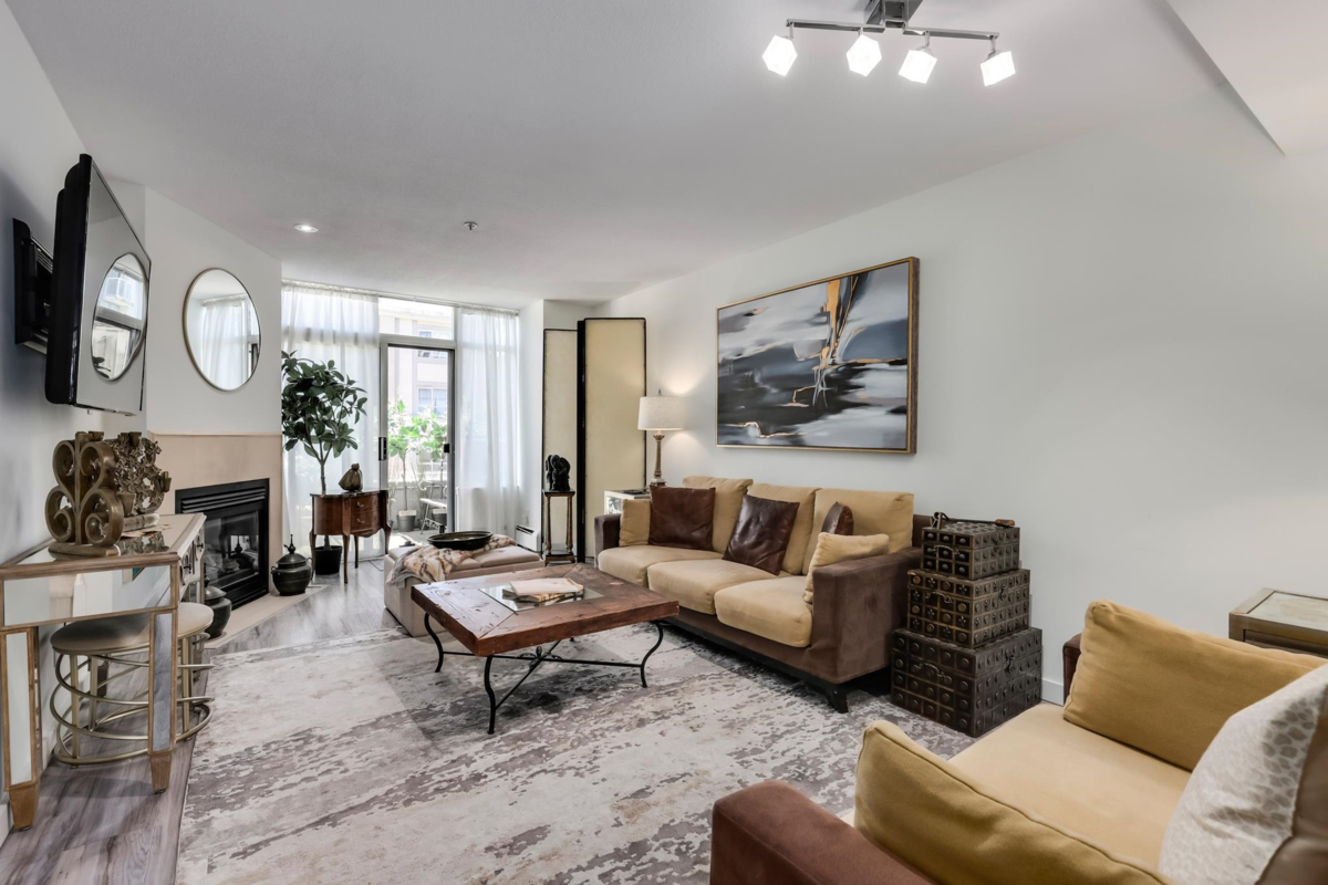 Very secure and quiet 3 bed, 2.5 baths, 2 level 5th flr T/H. Over $100K in recent renos: laminate floors on main, plush carpeting on staircase + 2nd lvl, chic vinyl flooring in washrooms, high-end stainless steel washer & dryer, refrigerator, gas stove and dishwasher from Whirlpool and Samsung. 3 spacious bedrooms with ample closet in the primary [can accommodate a king bed]. Gas fireplace. Generous 17’ x 11’ patio adjacent to huge communal garden and playground. Amenities: concierge, gym, I/D pool, hot tub, large sauna and meeting room. One U/G parking and a bike storage locker. Close to Skytrain, Crosstown School, Park, the new St Paul’s, Costco, Nester’s Market, T&T grocery and Int’l Village, Roger’s Arena, BC Place and restaurants. A city centre garden oasis and fabulous family home!